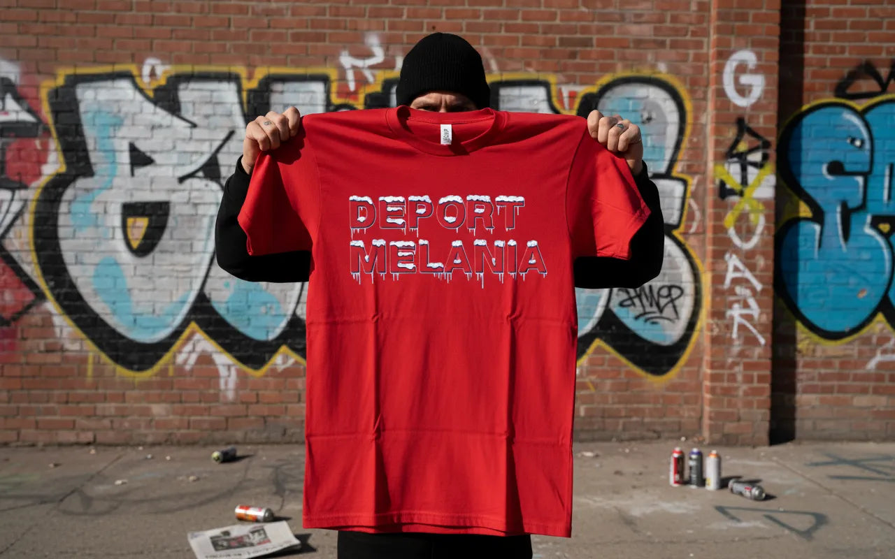 DEPORT MELANIA uses bold typography and high-contrast black-and-white formatting to deliver a message that’s impossible to ignore. No graphics, no decoration — just text, clarity, and confrontation.